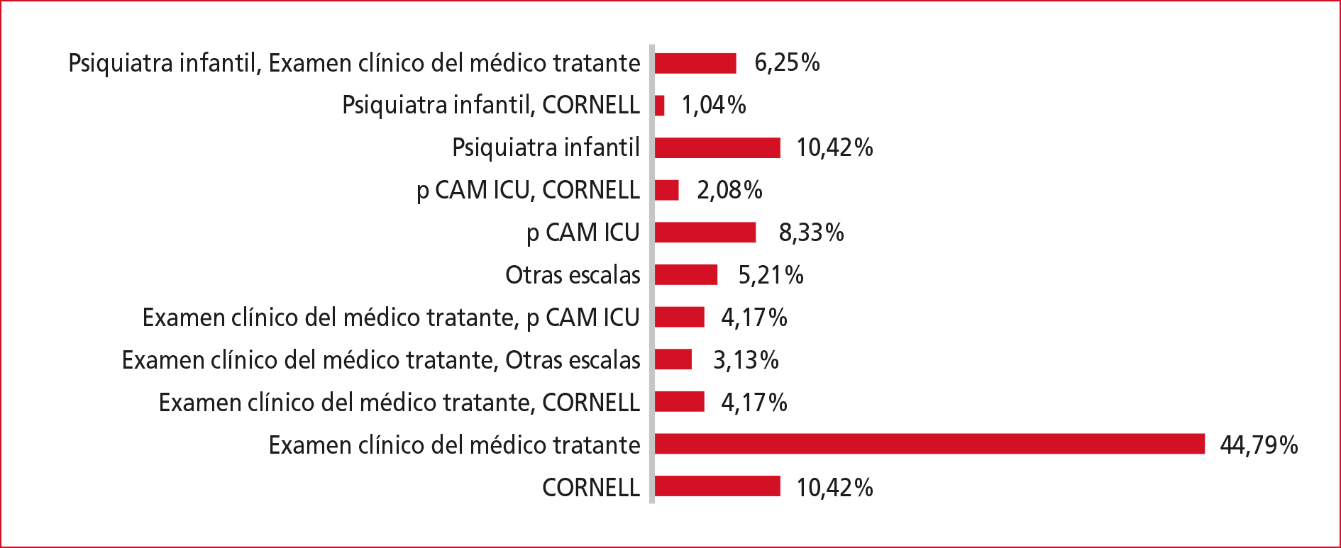 Resultados: De 170 médicos y enfermeros invitados a participar 113 respondieron. El 85,32% considera al delirio un evento esperado en las UCIP; el 87,16%, que el delirio está subdiagnosticado y el 90,27%, que es una situación que requiere intervención. Solo el 12,38% recibió suficiente capacitación. La escala más utilizada fue la de Cornell, mientras que la forma de detección más común fue el examen clínico del médico tratante. El 65,48% considera útil el uso de benzodiacepinas para tratar el delirio.