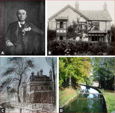 Figura 1. A. Retrato de Sydney Ringer (1835-1910). B. Casa de campo de Sydney Ringer en Lastingham, donde transcurrieron sus últimos años de vida. C. Vista del New River desde Londres. D. Imagen del New River en la actualidad.