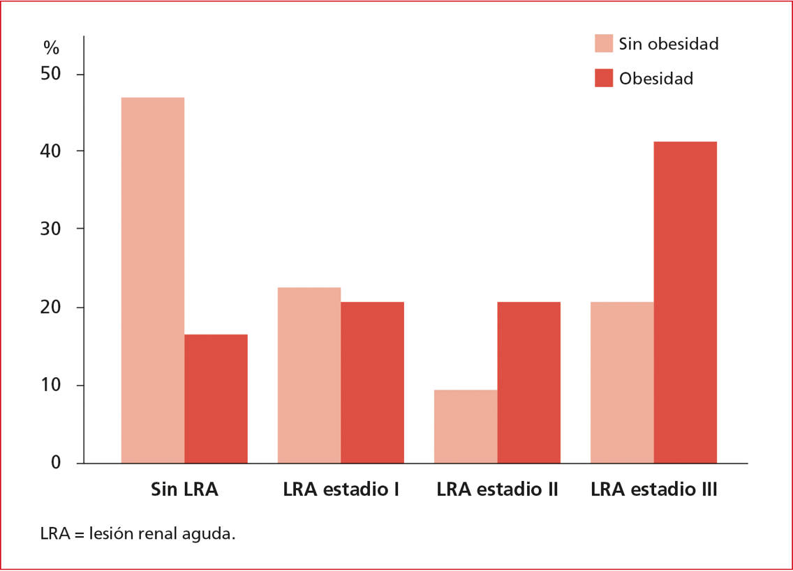 La frecuencia de LRA en toda la muestra (cualquier estadio KDIGO) fue del 62%, y su distribución por estadio y agrupado por cohortes se muestra en la Figura. La incidencia de LRA en la cohorte de pacientes obesos llegó al 79% (riesgo relativo 1,44; p <0,05).