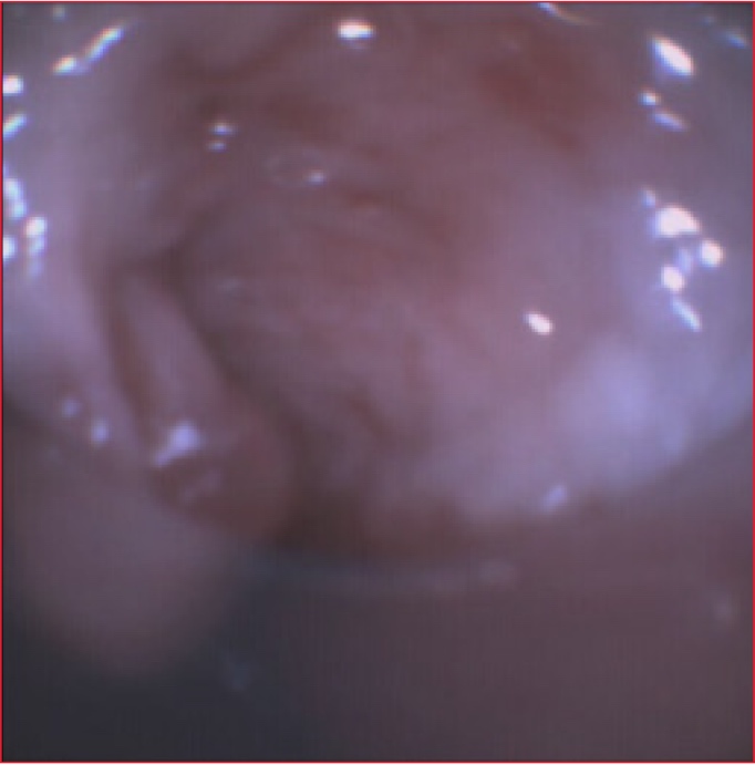 Tras 14 días de intubación, fue sometida a una traqueostomía percutánea, sin complicaciones inmediatas. No obstante, la ventilación fue dificultosa, porque la presión pico en la vía aérea estaba significativamente elevada aún en ausencia de secreciones o broncoespasmo. Por este motivo, se programó un estudio endoscópico para descartar lesiones estructurales o una cánula de traqueostomía inadecuada para las características anatómicas de la paciente.