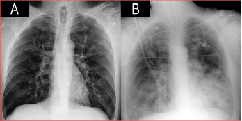 Varón de 53 años, con diabetes tipo 2 en tratamiento con insulina y mal controlada (HbA1c 11%). Acudió al Departamento de Urgencia por un cuadro catarral de cuatro días de evolución. A su llegada tenía insuficiencia respiratoria e hipotensión, la radiografía no mostraba infiltrados parenquimatosos (Figura 1). La reacción en cadena de la polimerasa fue positiva para el virus influenza A (subtipo H1N1 variante 2009), por lo que se inició el tratamiento con oseltamivir junto con ceftriaxona y levofloxacina. El antígeno urinario para Streptococcus pneumoniae y Legionella pneumophila tipo 1 fue negativo. Tras 24 h, el estado clínico empeoró y se decidió el ingreso en la Unidad de Cuidados Intensivos. Los análisis de laboratorio revelaron leucocitosis y marcadores inflamatorios elevados. A pesar del soporte respiratorio con oxigenoterapia de alto flujo, el paciente no mejoró y requirió intubación orotraqueal y ventilación mecánica invasiva. En la radiografía posintubación, apareció una condensación incipiente en el lóbulo inferior izquierdo, por lo que se sustituyó ceftriaxona por meropenem. Las siguientes 48 h estuvieron marcadas por un empeoramiento progresivo: insuficiencia respiratoria a pesar de la ventilación protectora, shock con pobre respuesta a fármacos vasoactivos e inotrópicos, coagulopatía e insuficiencia renal aguda, con anuria. Se inició hemodiafiltración venovenosa continua. A las 72 h del ingreso en la Unidad de Cuidados Intensivos, continuó la progresión clínico-radiológica con evidencia de infiltrados bilaterales algodonosos (Figura 1) y aumento de la necesidad de FiO2.