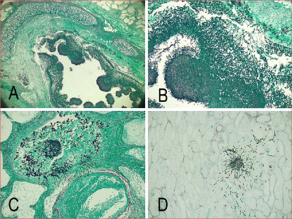 Figura 2. A. Tinción de Giemsa x2,5. Micetoma bronquial tipo Aspergillus. B. Tinción de Giemsa x10. Micetoma bronquial tipo Aspergillus. C. Tinción de Giemsa x10. Pulmón. Hifas tipo Aspergillus con invasión vascular y trombosis. D. Tinción de Giemsa x10. Riñón. Hifas tipo Aspergillus.