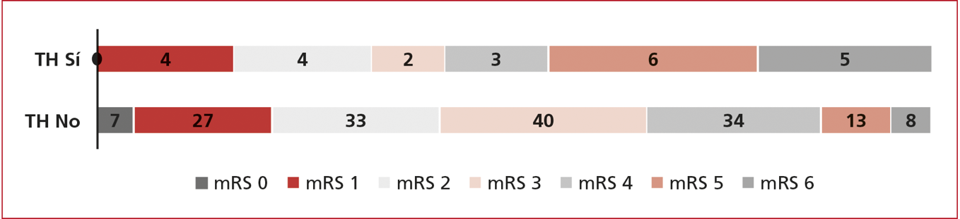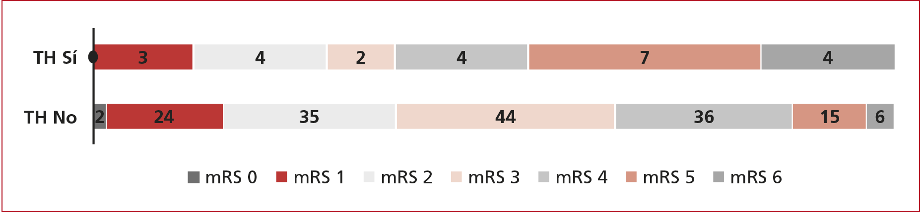 A pesar de los avances en el tratamiento de la reperfusión de la ECV, las complicaciones que ocurren en el período agudo, como la TH, incrementan la mortalidad y condicionan peores resultados clínicos funcionales en los sobrevivientes.7 Esta premisa también se comprobó en este estudio, ya que los peores resultados funcionales y la muerte fueron más frecuentes en quienes desarrollaron TH comparados con los que no (45,8% vs. 13%) (p <0,001).