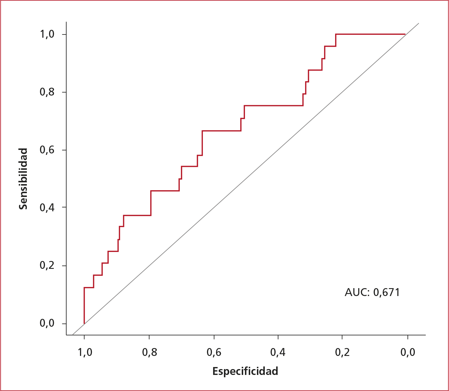 La capacidad predictiva del INL con el modelo multivariado alcanzó una especificidad del 63,2% (IC95% 55,8-71,2%); una sensibilidad del 66,7% (IC95% 45,8-83,3%), un área bajo la curva de 0,671. El valor del INL ≥4,67 se correspondió con el mejor punto de corte (sin ajuste) para predecir la TH (Figura 3).