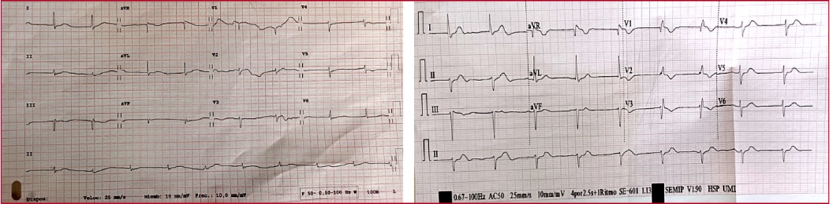 Figura. Evolución electrocardiográfica. Primer ECG donde se objetiva ritmo sinusal y posteriormente evolución con un bloqueo de rama derecha.