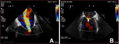 Figura. Caso 1. Ecocardiograma transesofágico doppler color antes de la implantación del MitroClip® (A) y después (B).