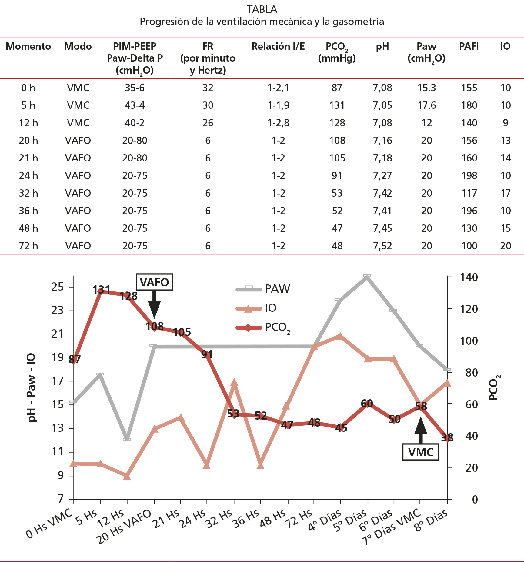 Luego de 20 h de VMC, se inició la VAFO con respirador Fabian HFO (Acutronic Medical System), utilizando presiones medias de la vía aérea superiores a la de la VMC, altos deltas de presión y frecuencia respiratoria óptima (frecuencia donde se produce un transporte de gas adecuado en combinación con las presiones menos perjudiciales, baja en enfermedades obstructivas, 5-7 Hertz),15 se observó un descenso gradual de la presión parcial de dióxido de carbono, hasta del 50% a las 12 horas.