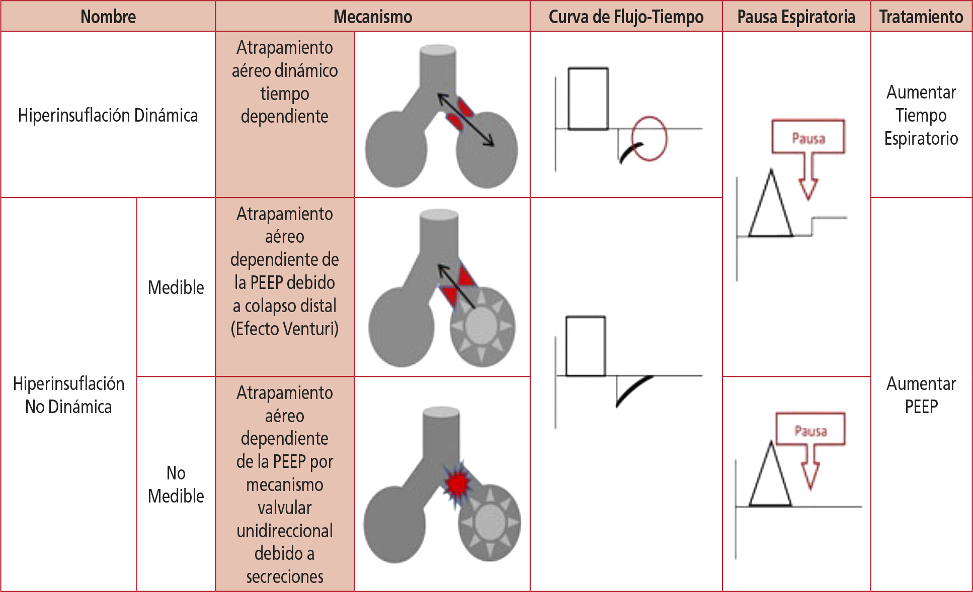 El grado de hiperinsuflación puede ser no mensurable mediante la curva de flujo-tiempo o pausa espiratoria (Figura 1).19 Es posible que dicho atrapamiento sea dependiente de un agregado de PEEP a fin de funcionar como stent mecánico de las vías obstruidas, permitiendo su vaciado, con la presión meseta como un sustituto adecuado en la valoración del grado atrapamiento (auto-PEEP oculta).20