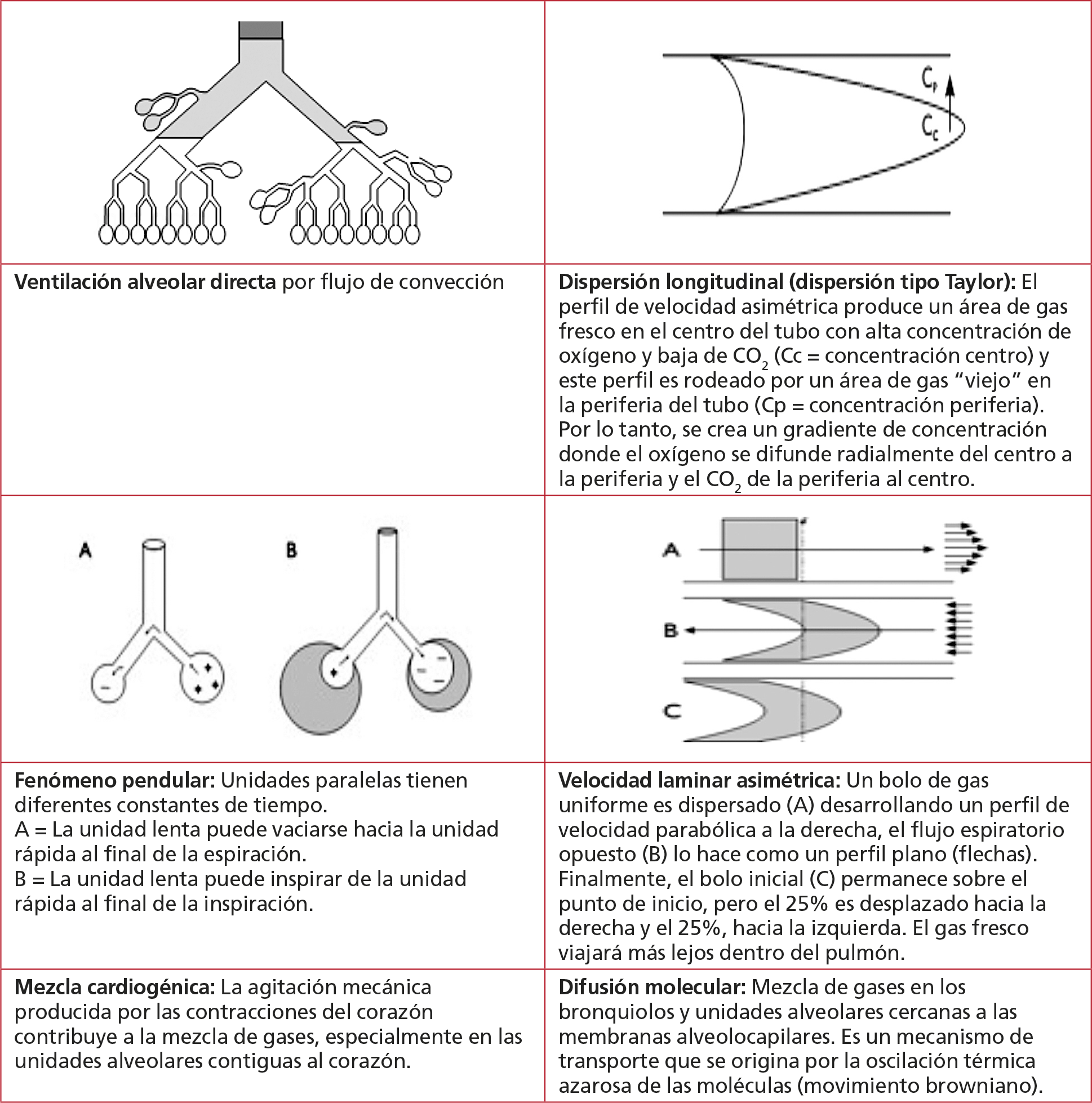 En el anterior fundamento, se sustenta el uso de la VAFO como rescate frente a la hipercapnia, permitiendo, una vez mantenida permeable la vía aérea mediante una presión media de la vía aérea constante, actuar a los distintos mecanismos implicados en la ventilación de alta frecuencia [(ventilación alveolar directa, dispersión longitudinal, fenómeno pendular, velocidad laminar asimétrica, mezcla cardiogénica, difusión molecular); Figura 2] asociados a una espiración activa.8 En este sentido, Slee-Wijffels et al publicaron una serie de 53 eventos en VAFO en 51 pacientes pediátricos, 17 de ellos con enfermedad de la pequeña vía aérea, y comunicaron una supervivencia más prolongada en este grupo (88% vs. 56%) en comparación con el grupo de daño alveolar difuso. Los pacientes con enfermedad de la pequeña vía aérea tenían una presión parcial de dióxido de carbono de 66,9 ± 27,9 mmHg antes de la transición a VAFO, que disminuyó rápidamente 1 h después de iniciada a 51,6 ± 15,5 mmHg.11 Esta respuesta también fue comunicada en la serie de Donoso. Veinte pacientes, con una mediana de 4 meses de edad y un peso de 5,2 kg, tenían, antes de la VAFO, una presión parcial de dióxido de carbono de 82 ± 20 mmHg y un pH 7,15; el tratamiento de rescate fue útil en la eliminación de CO2, generando una reducción estadísticamente significativa apreciable desde la primera hora (presión parcial de dióxido de carbono en 37 ± 22 mmHg, p <0,05).12