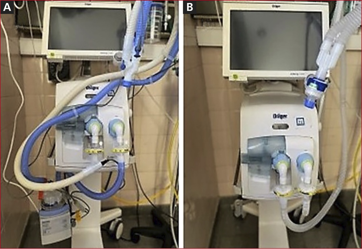 Figura 1. Circuitos respiratorios. A. Circuito respiratorio con humidificador activo, tubuladuras con alambre caliente y filtros bacterianos/virales. B. Circuito respiratorio extensible, con humidificador pasivo y filtros bacterianos/virales.