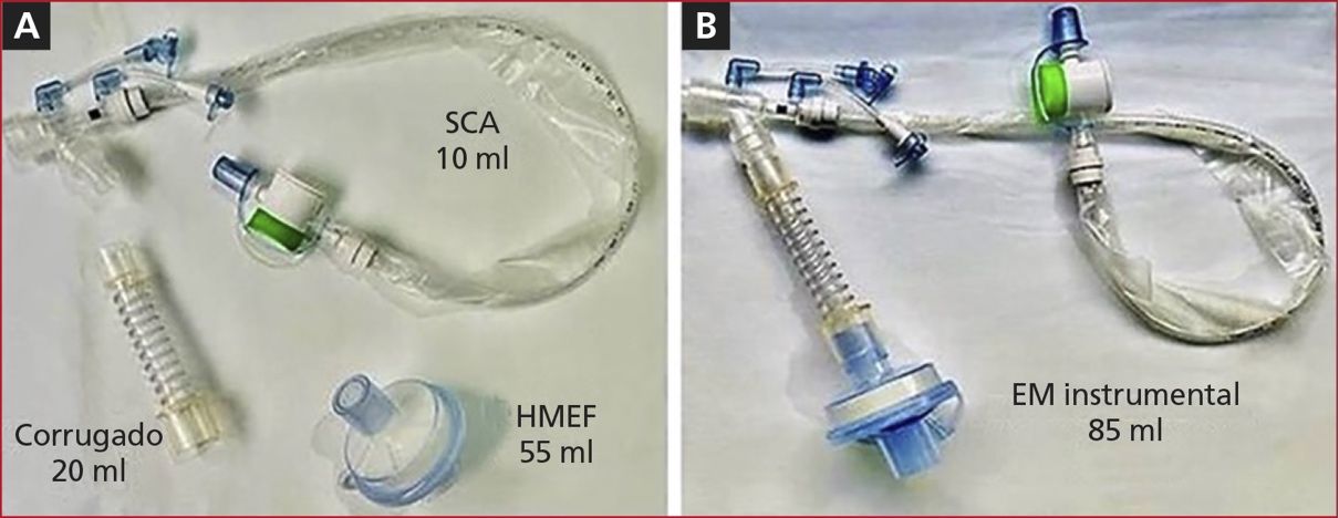 Es conveniente evitar el uso de interfaces que generen un aumento innecesario o prescindible del espacio muerto instrumental: catéteres o tubos extensibles, HME o HMEF de volumen interno excesivo (>60 ml) y conectores. En la Figura 2, se muestran las interfaces y su contribución al espacio muerto instrumental.