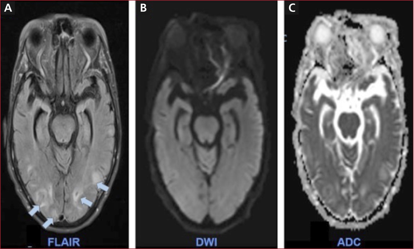 Figura. Resonancia magnética cerebral. A. Secuencia FLAIR. Se observan múltiples zonas