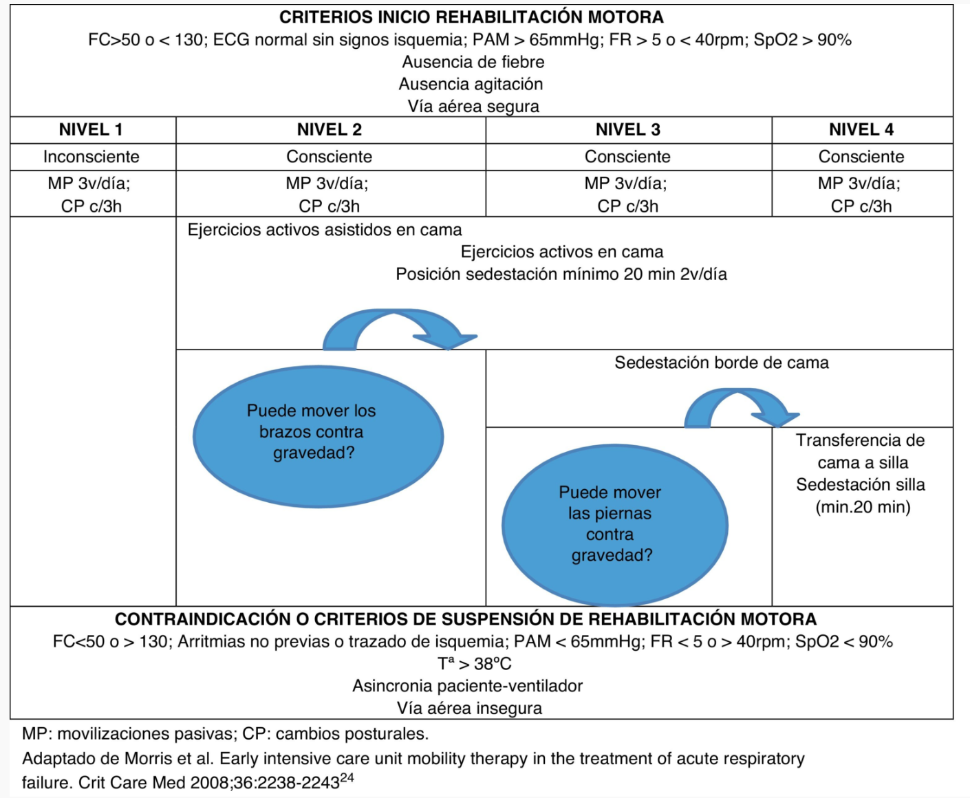 Con la reciente aparición de las guías PADIS de la SCCM (Clinical Practice Guidelines for the Prevention and Management of Pain, Agitation/Sedation, Delirium, Immobility, and Sleep Disruption in Adult Patients in the ICU, de acceso gratutio[1]) se refuerza aún más la necesidad de implementar programas de movilización precoz, lo que también se pone de manifiesto en el paquete de medidas (bundle) ABCDEF (http://iculiberation.org/) que hace referencia la manejo adecuado de la analgesia, la combinación adecuada de la vacación de sedación y la prueba de ventilación espontánea, la elección adecuada de fármacos, la prevención y manejo del delirium, la movilización precoz y la inclusión y empoderamiento familiar.