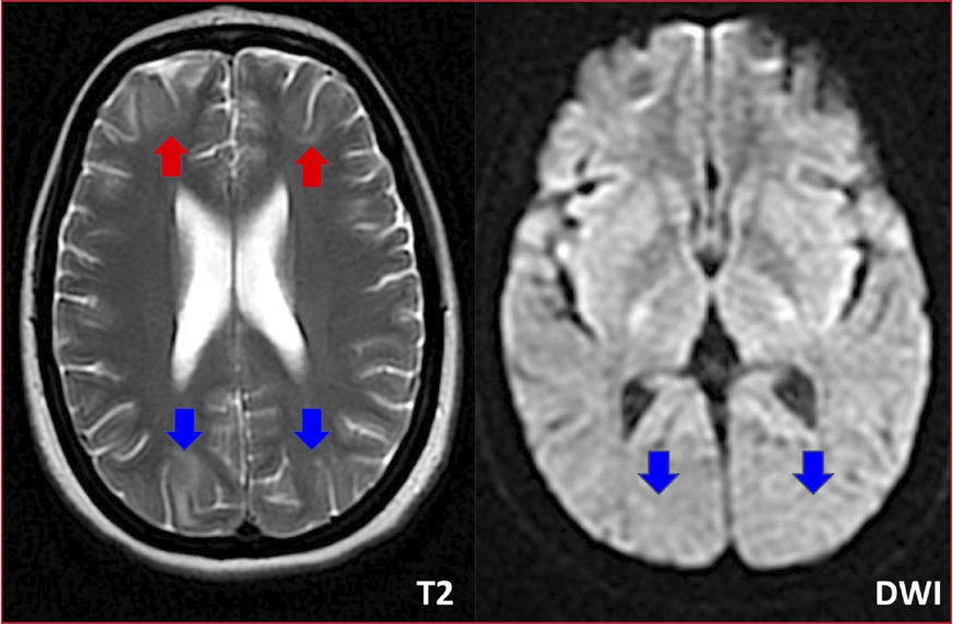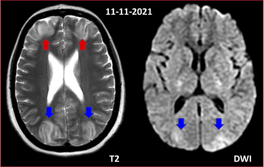 Figura 1. Resonancia magnética de cerebro. Cambios de señal hiperintensos en secuencia T2,corticales, en la región fronto-parieto-occipital, bilaterales, simétricos (flechas rojas y azules),sin restricción significativa a la difusión, como así también, en el sector postero-inferior de ambos hemisferios cerebelosos.