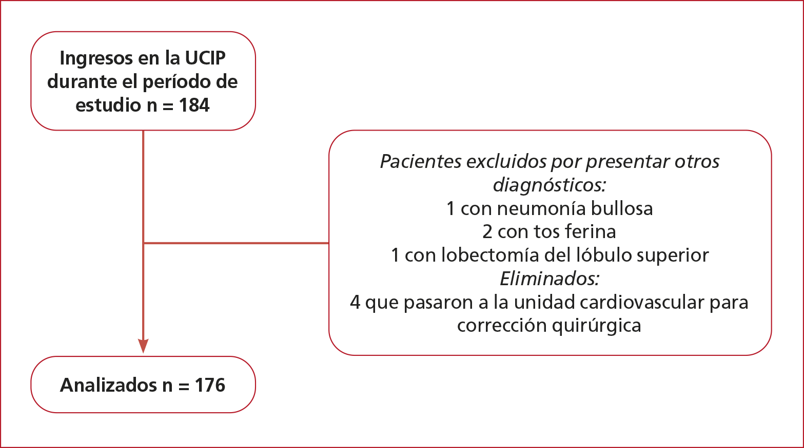 Durante el período de estudio, ingresaron 184 pacientes y se analizaron 176 (Figura). El 63% era del sexo masculino, con una mediana de edad de 4 meses (RIC 2-7) y una mediana de peso de 6 kg (RIC 5-7,7), 77 (37%) tenían un cuadro crónico complejo y 16 (9%), un síndrome genético. A 163 (93%) se les diagnosticó bronquiolitis y, al resto, neumonía. Cuatro niños (2%) murieron, dos tenían un cuadro crónico complejo de base. Los gérmenes más frecuentes fueron: virus sincicial respiratorio y adenovirus. Las características generales de la población, su evolución y comparación se muestran en la Tabla 1.