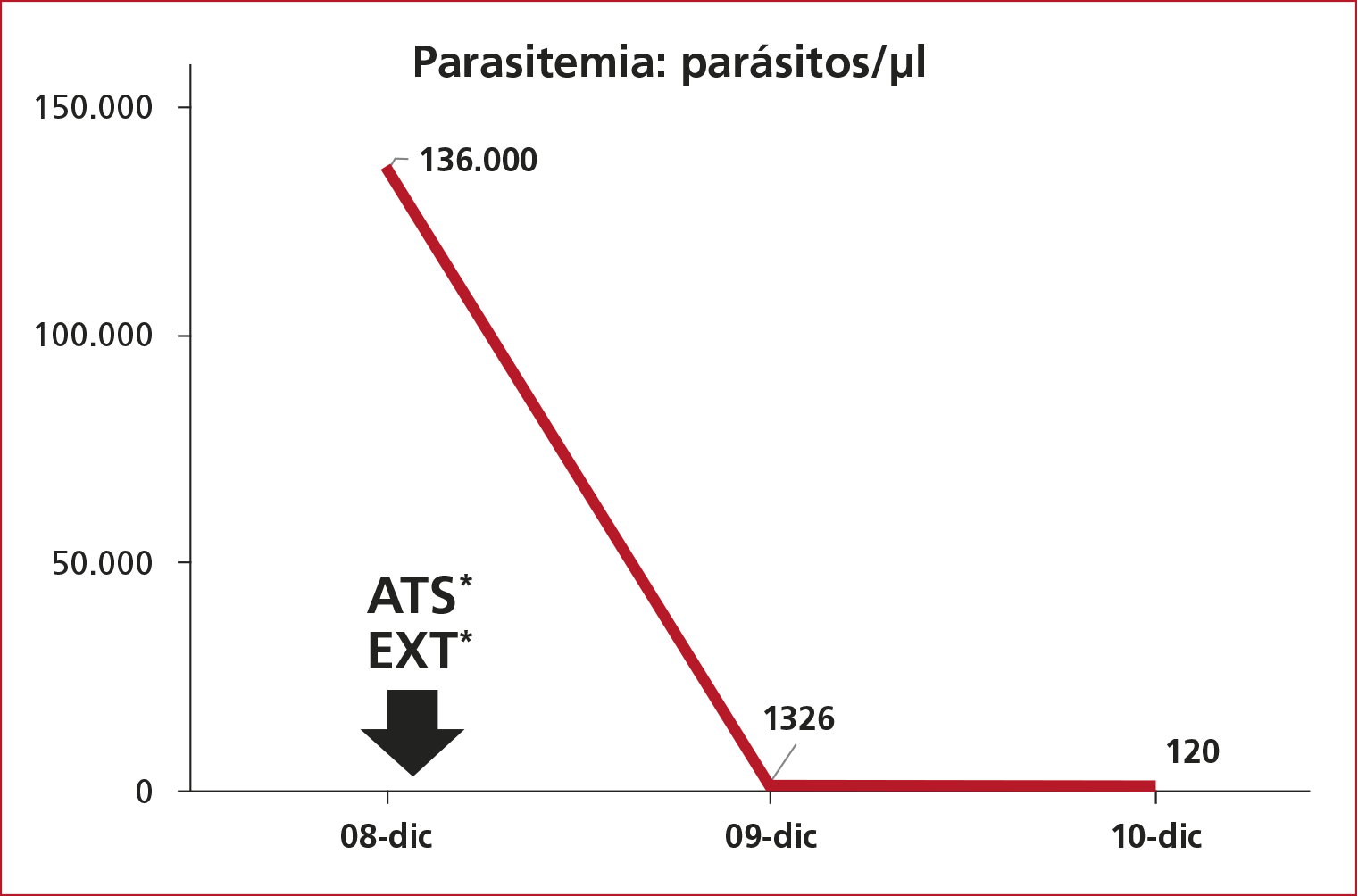 Paciente de 36 años que ingresó en la Unidad de Terapia Intensiva con síndrome febril de 7 días de evolución, en diciembre de 2021. Tenía antecedentes de viaje a Nigeria, sin profilaxis, y diagnóstico de malaria grave, síndrome de insuficiencia de múltiples órganos (renal, hematológica, pulmonar y hepática), mala perfusión periférica (acidosis metabólica, hiperlactacidemia) e hipoglucemia.